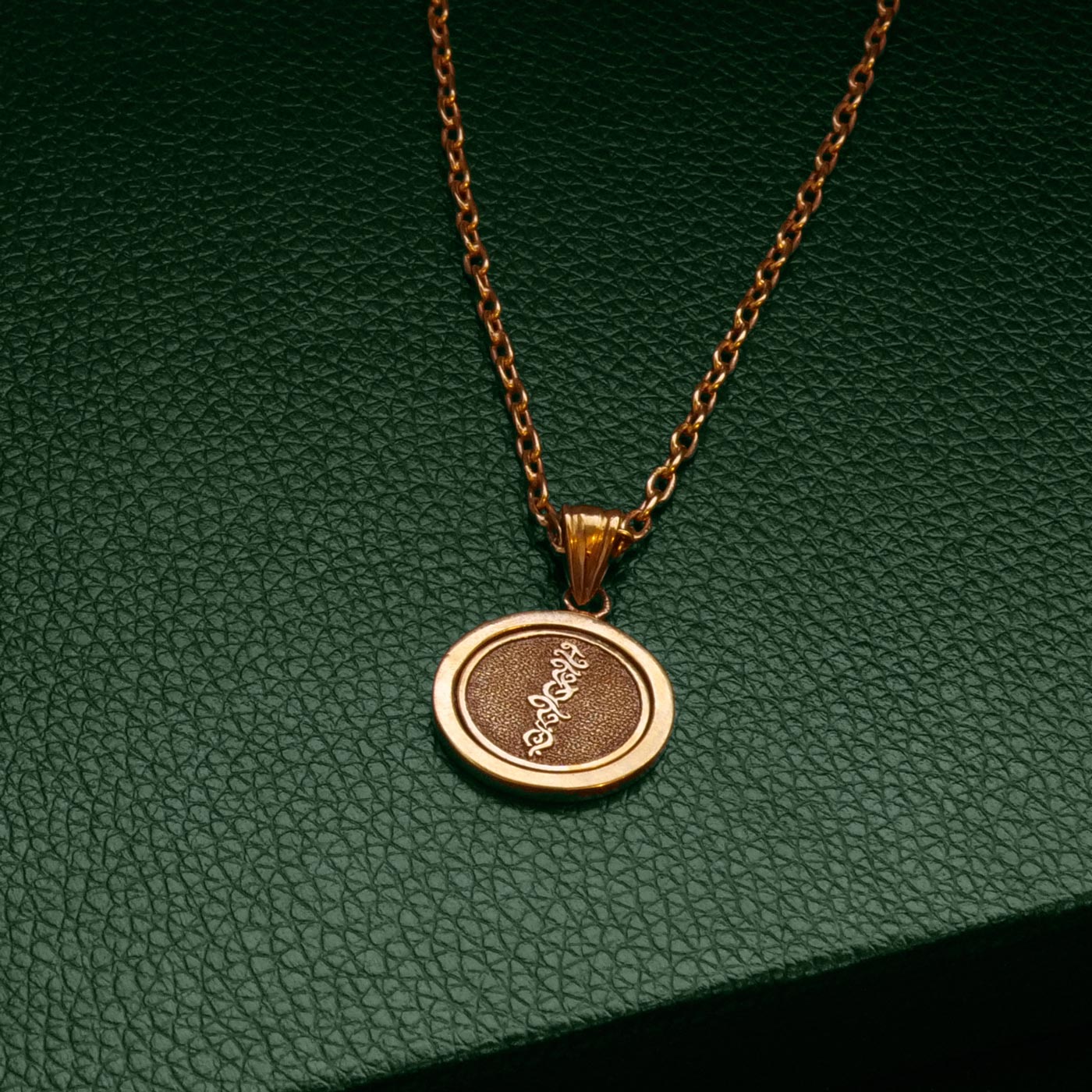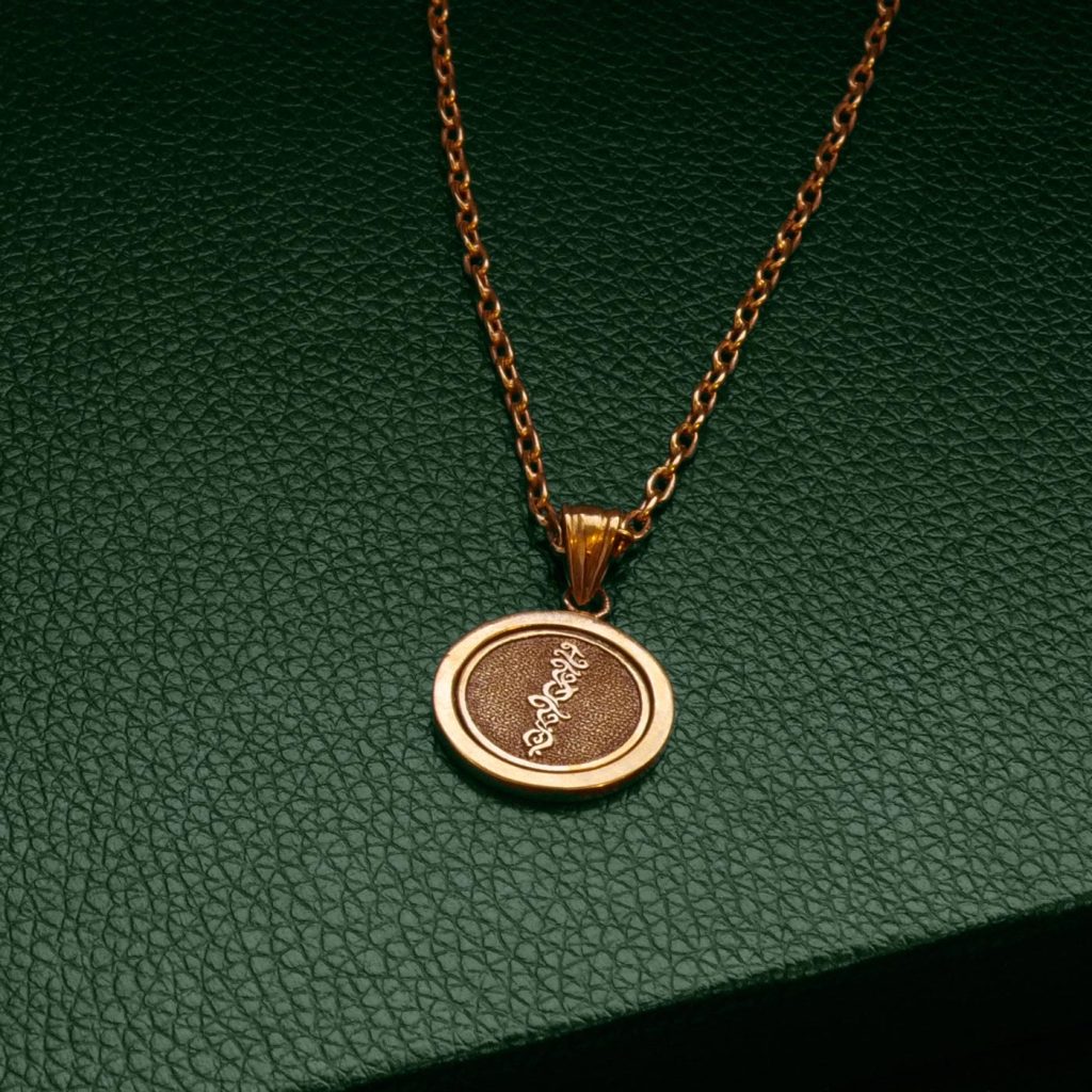 The inner circle – engraved with traditional Baybayin script spins freely within the outer frame. Crafted in 18k gold vermeil, this pendant seamlessly blends artistry with movement, allowing the hand hammering to catch the light as it rotates.